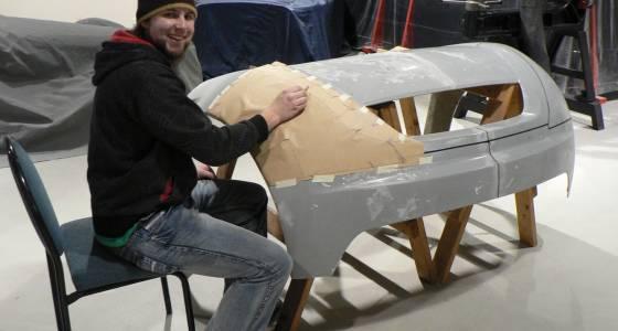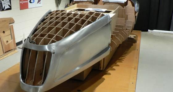 The main focus being the hand forming of the aluminium skin to fit a timber Buck and formers produced from Math Data created by the head Designers from GM Holden. Jamie Downie worked along side Brian Tanti to create the body panels which will be attached over the Carbon Fibre chassis of the FR.1 car. Jamie Downie and Kustom Garage have donated time to the FR.1 project for over seven years and will proudly continue.